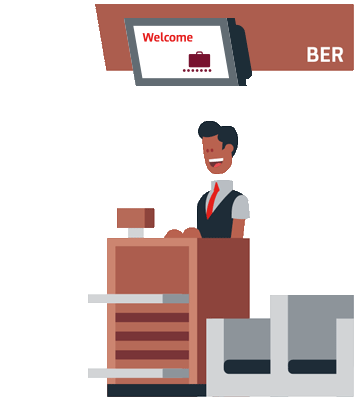 An animated Ber Sxf sticker showing a friendly airport employee welcoming travelers at a check-in counter.