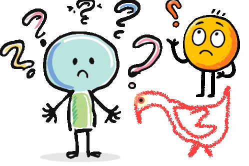 A cartoon stick figure and an emoji-like character look confused and sad, surrounded by question marks, with a red bird.