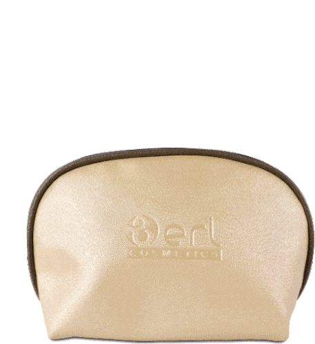 A beige Berl Cosmetics pouch with various skincare products, including a tube and a jar, appearing and disappearing.