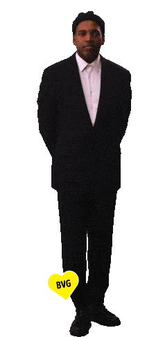 A man in a black suit, known as a Berlin bouncer, poses with crossed arms, featuring the BVG logo.