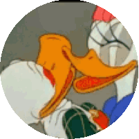 Donald Duck's face is covered in cute red lipstick kisses, looking flustered but happy.