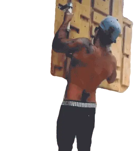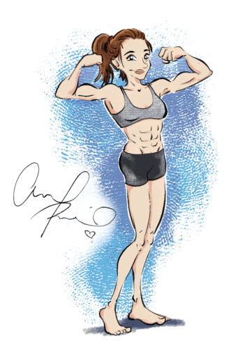 A cartoon drawing of Alex Puccio, a strong climber, flexing her impressive muscles and abs. Perfect for fitness and bouldering fans.