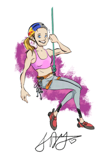 Cartoon sticker of Sasha Digiulian, a climber from Best Boulders, hanging from a rope in full gear.