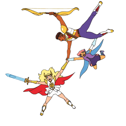 She-Ra, Glimmer, and Bow from She-Ra and the Princesses of Power, the Best Friend Squad, holding hands upside down.