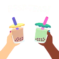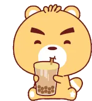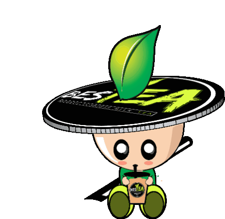 A cute Bestea Boba mascot character with a large hat and tea leaf, happily drinking an Ube Latte.