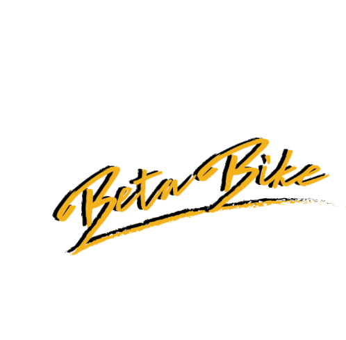 An animated sticker featuring the 'Beta Bike' logo, dynamically drawn in a stylish yellow and black handwritten font.