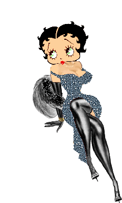 Betty Boop, the iconic cartoon character, strikes a sparkling pose in her blue dress, sitting elegantly with legs crossed.