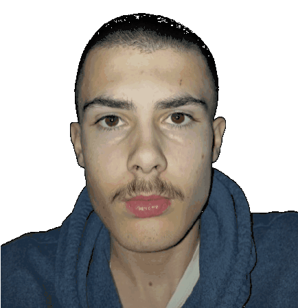 a man with a mustache is wearing a blue sweater