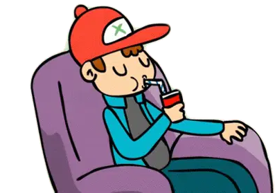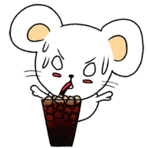 A stressed cartoon mouse with sweat drops on its head intensely drinks a cold, dark beverage with ice through a straw.