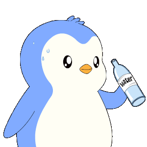 A cute cartoon penguin, sweating slightly, eagerly drinks water from a bottle to quench its thirst.