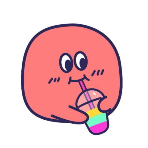 A cute red blob character happily sips a colorful beverage through a straw, showing contentment.