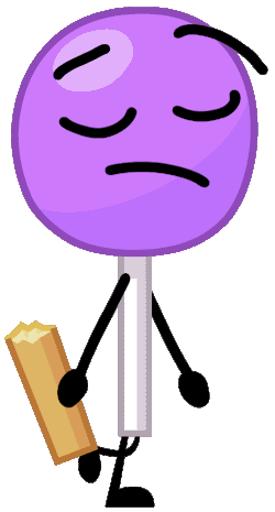 Lollipop from Battle for Dream Island, a purple character, holds a piece of wood with a tired expression.