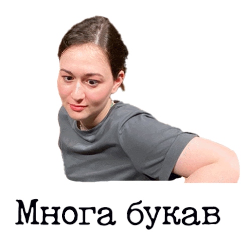 a woman in a gray shirt is behind a sticker that says mhora bukab