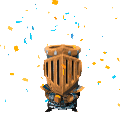 A cheerful knight from Big Helmet Heroes celebrates with confetti, expressing gratitude with the word 'Merci' (Thank You).