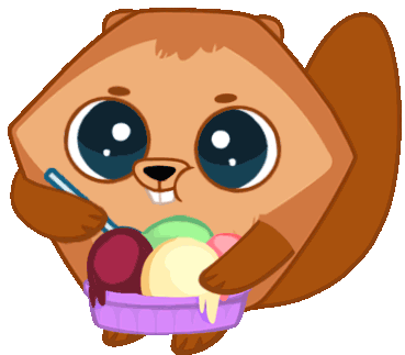 Bibipet, a cute cartoon beaver, happily enjoys a delicious bowl of colorful ice cream with a spoon.
