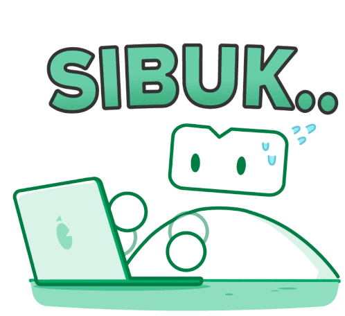 Bibit Bobit character is busy working on a laptop, showing sweat and the word 'Sibuk' (Busy) above. Perfect for expressing a busy mood.