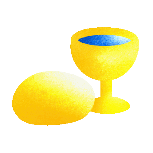A golden chalice with blue liquid and a golden loaf of bread, symbolizing the Holy Bible, God, and Christian faith.