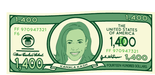 Animated $1400 stimulus bill featuring Kamala Harris, representing the Biden Bucks and Covid Relief Plan.