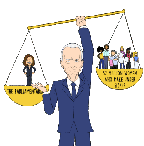 Joe Biden holds a scale balancing Kamala Harris, the Parliamentarian, against 32 million women making under $15/hr.
