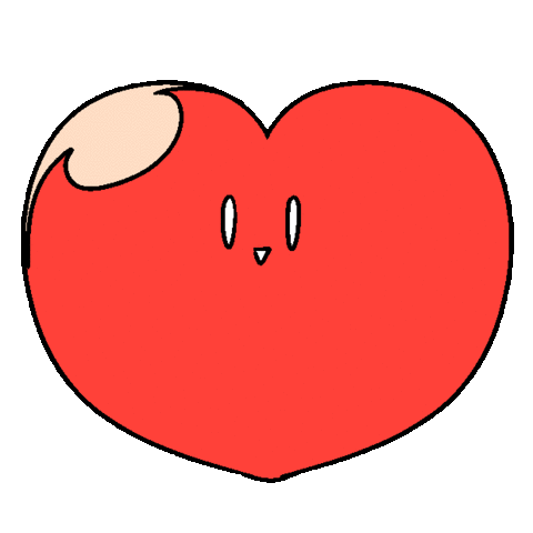 A charming red heart character with small eyes and a tuft blinks, then widens its eyes and smiles sweetly, conveying affection.