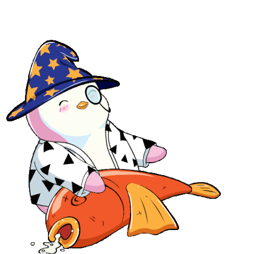 A cute Pudgy Penguin wizard, wearing a star-spangled hat and monocle, proudly sits atop a large, caught orange fish, celebrating a big score.