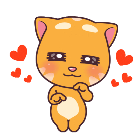 An adorable orange cartoon cat expresses love and affection with hearts floating around, then winks and points.