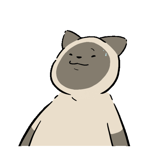 A cartoon cat-like character in a hooded outfit displays an embarrassed, forced grin and wipes sweat from its forehead.