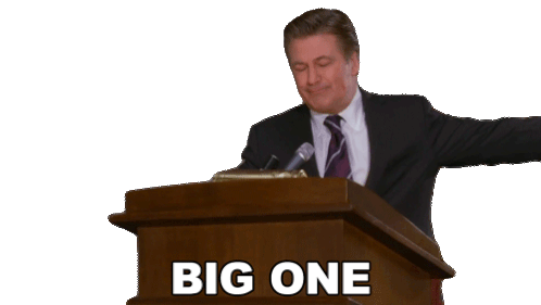 Jack Donaghy (Alec Baldwin) from 30 Rock emphatically declares "BIG ONE" while gesturing at a podium.
