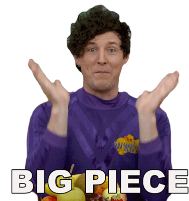 Lachy Wiggle from The Wiggles reacts with a shrug and wide eyes to the phrase 'Big Piece', expressing surprise or confusion.