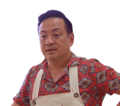 Vincent Chan from The Great Canadian Baking Show sighs with a frustrated expression, wearing a patterned shirt and apron.