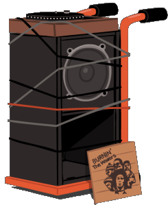 A large black speaker on an orange dolly with a turntable and a Bob Marley 'Burnin' The Wailers' album cover.