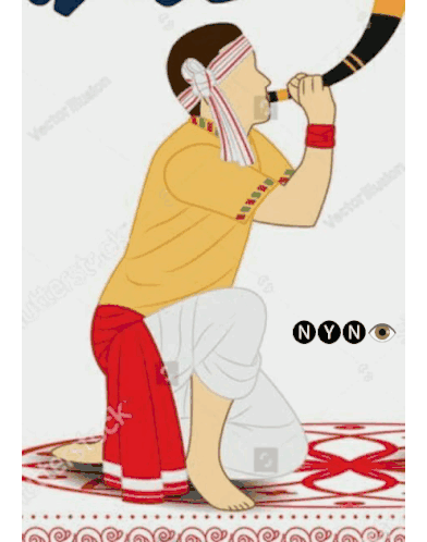 Celebrate Bihu with this vibrant sticker featuring traditional Assamese instruments, attire, and the 'Happy Bihu' greeting.