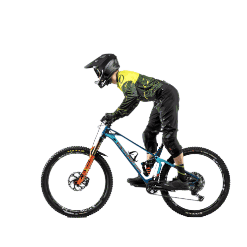 A skilled mountain biker from Bike School Pekoll performs an impressive, dynamic bike stunt, showcasing advanced riding techniques.