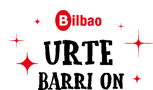 A festive sticker from Bilbao wishing 'Urte Barri On' (Happy New Year) with red stars.