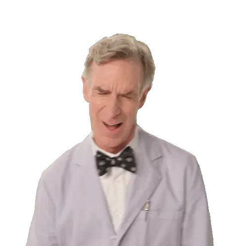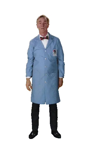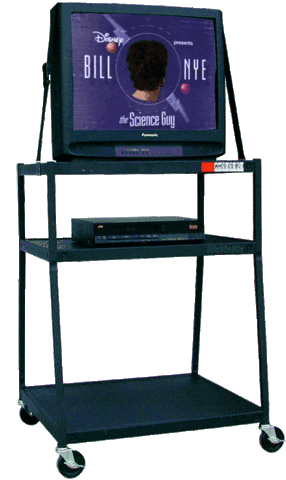 A classic TV on a rolling cart displaying 'Bill Nye The Science Guy', featuring Bill Nye's image and a VCR player.