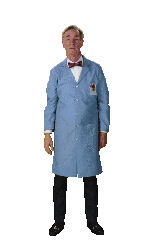 Bill Nye the Science Guy points upwards with both hands, wearing his signature lab coat and bow tie.