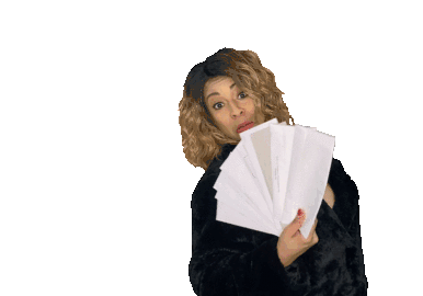Holly Logan, dressed in a black fur coat, fans herself with a stack of bills before dramatically throwing them into the air.