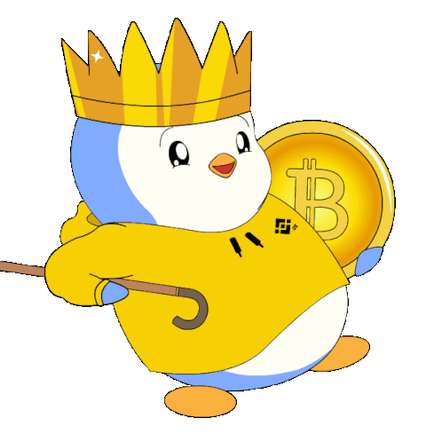 a penguin wearing a crown and holding a bitcoin