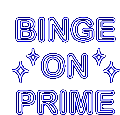 Animated neon text 'BINGE ON PRIME' and 'बिंजऑनप्राइम' with sparkling stars, encouraging viewers to watch content on Amazon Prime Video.