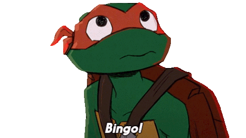 Michelangelo, the Teenage Mutant Ninja Turtle, exclaims 'Bingo!' with a triumphant smile and clenched fist.