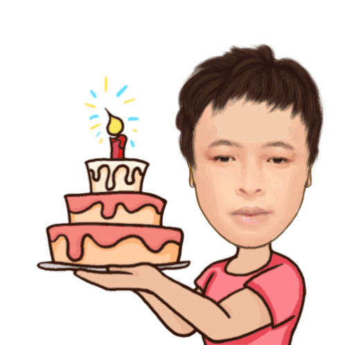A cartoon character, Binhminh Bongcoi, holds a birthday cake with a lit candle, celebrating a happy birthday.