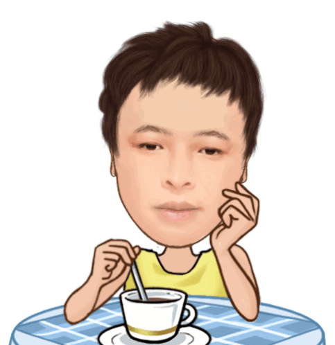 Binhminh Bongcoi, a cartoon character, sits at a table, stirring coffee with a spoon, looking bored or tired while waiting.