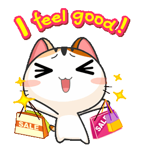 Birbhaus cat joyfully holds shopping bags with 'SALE' signs, exclaiming 'I feel good!' in this happy sticker.