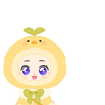 An adorable animated character in a yellow bird costume with a leaf on its head, transitioning from a cheerful smile to a serious, expressionless face with thought dots.