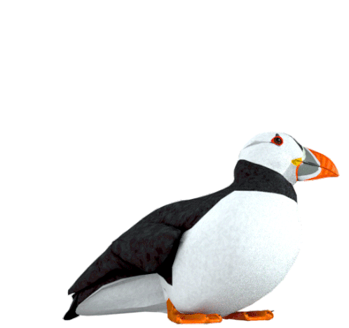 An animated puffin bird tilts its head curiously, appearing to be deep in thought or observing its surroundings.