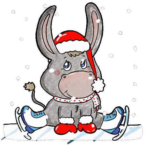 Birene's adorable Christmas donkey, wearing a Santa hat and scarf, sits on ice with skates and mittens, surrounded by snowflakes.