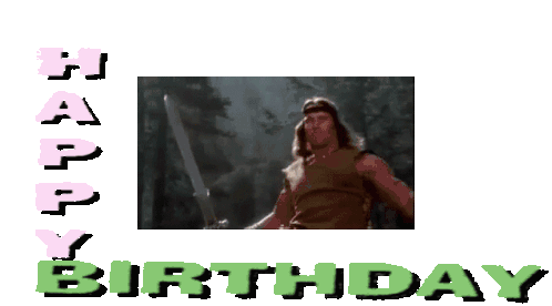 Arnold Schwarzenegger as Conan the Barbarian swings his sword in a classic 'Happy Birthday' animated sticker.
