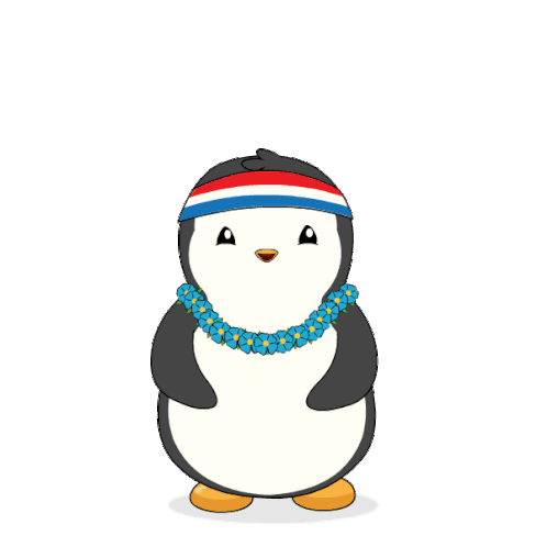 A cute animated penguin celebrates with a 'Happy Birthday' banner, wearing a headband and flower lei.