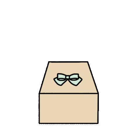A cute, light green creature with a neutral expression sits inside an open cardboard box, resembling a birthday or surprise gift.