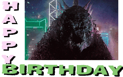 A powerful Godzilla monster wishing 'Happy Birthday' amidst a city skyline at night.